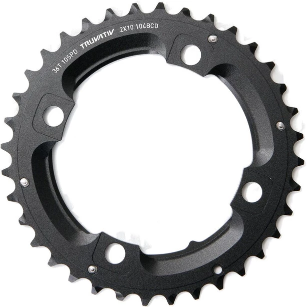 Ce plateau SRAM/Truvativ est disponible en 36 ou 38 dents, entraxe des trous de 104 mm et convient aux pĂ©daliers 2×10.Â